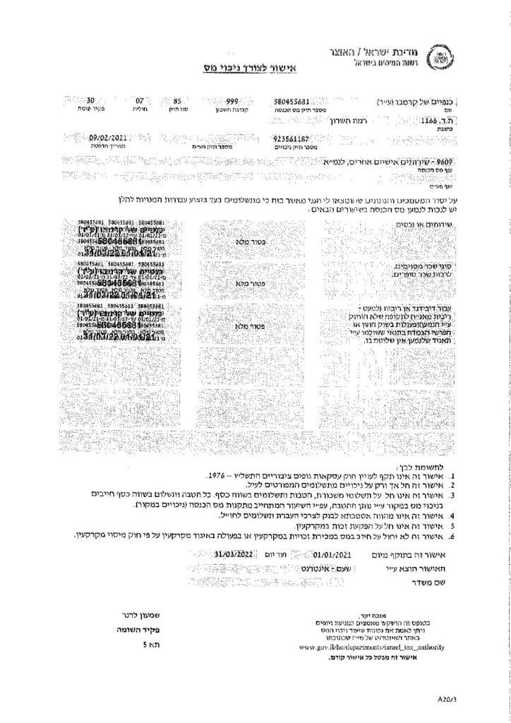 אישור לצורך ניכוי מס 2021