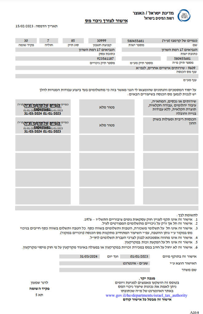 אישור ניהול ספרים וניכוי מס במקור 2023